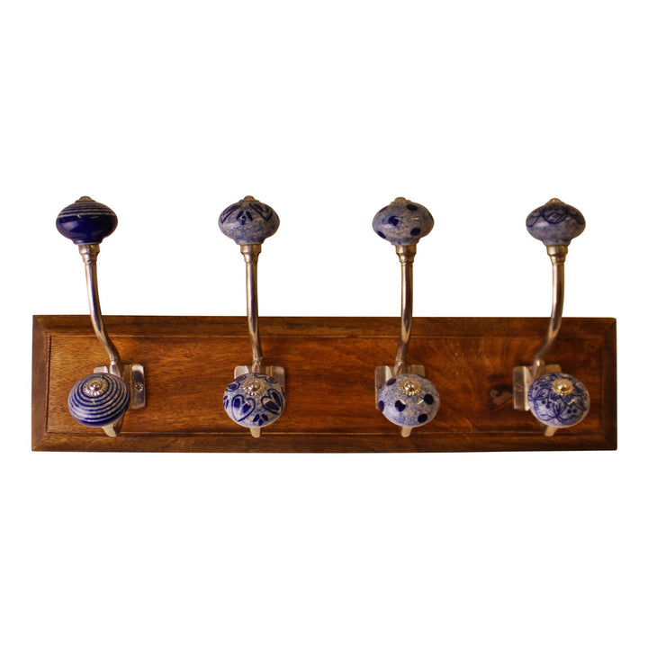 A set of 4 double Ceramic Blue and white coat hooks on a wooden base. Each hook have a different pattern. These stylish and ornamental coat hooks would look perfect in the entrance hall and make a functional item beautiful. Wooden base 44x10.5cm each hook 16x8cm. The base is made of mango wood and the knobs are ceramic with metal detailing. There are 2 fittings to the rear for wall hanging. Measurements: 10 x 18 x 44cm SKU: HH5616