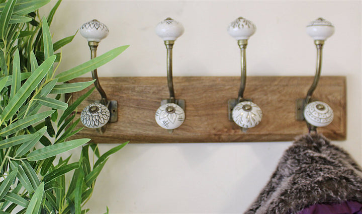 A stylish set of 4 double ceramic coat hooks in ivory with gold and grey detailing on a wooden base. Wooden base 44x10.5cm each hook 16x8cm. The base is made of mango wood and the knobs are ceramic with metal detailing. There are 2 fittings to the rear for wall hanging. Measurements: 10 x 18 x 44cm SKU: HH5635