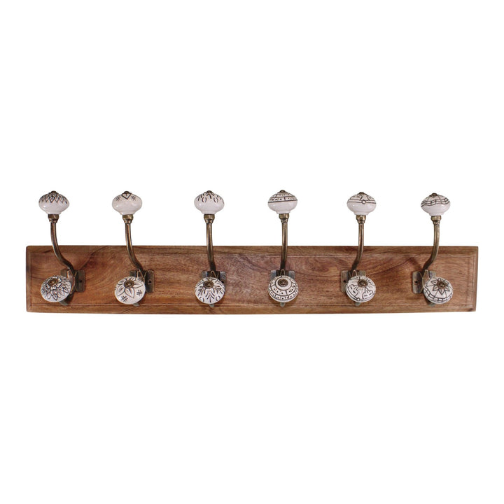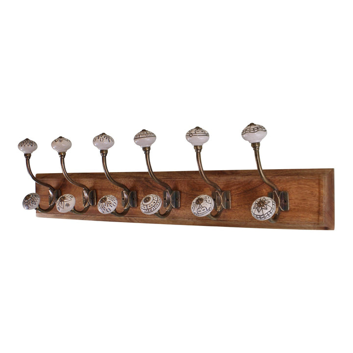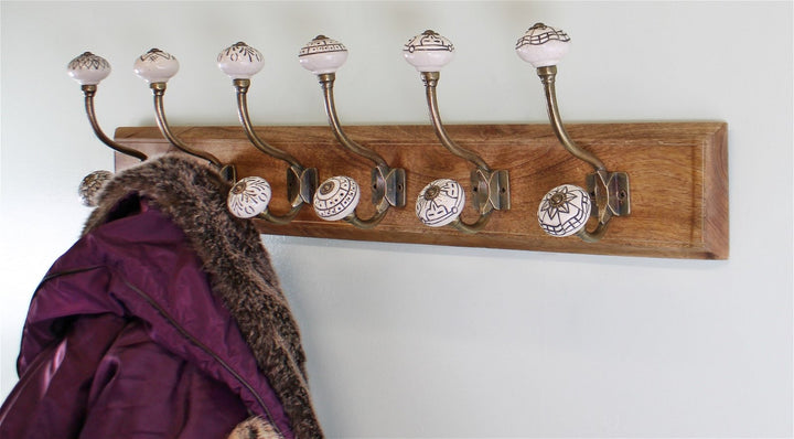 Ivory coloured ceramic hooks on a wooden base, stylish and ornamental, making a functional item beautiful. Wooden base 69x10cm each hook 16cm high x 9cm deep. Maximum load weight 15kg. The base is made of mango wood and the knobs are ceramic with metal detailing. There are 2 fittings to the rear for wall hanging. Measurements: D11 x H16 x W69cm