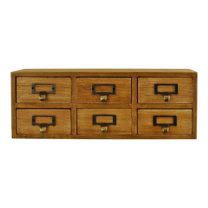 Set of 6 wooden storage drawers for various uses. Good solid wooden drawers with metal handles and room for labels. A really useful addition to your office desk and useful storage for smaller items. Individual internal drawer sizes W8.5 D9.5 H3.4cm. Natural Wooden finish. Measurements: 12 x 13 x 36cm. The nameplate card insert size is 34 x 16mm with a display area of 31 x 12mm (not included).