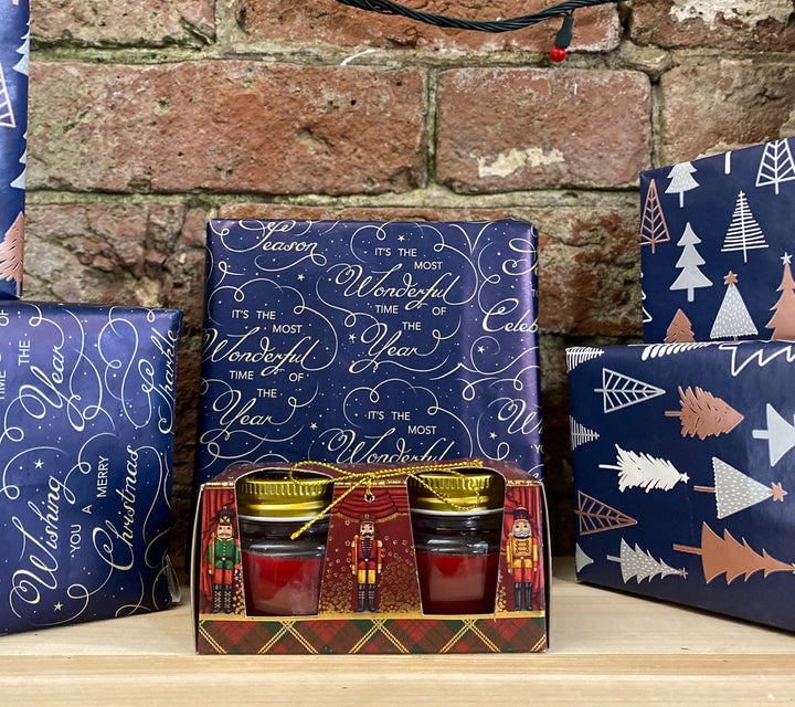 A Set of 2 red candles in jars with lids. A set of two festive red candles each in a glass pot with gold lids. The candles measure 4.5cm in diameter and 5.5cm in height. This item comes gift boxed and would make a perfect gift to add a bit of festivity to a room. Overall boxed measurements: D6 x H6 x W12cm