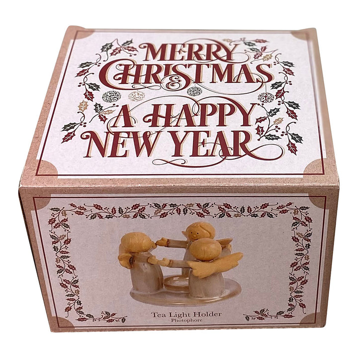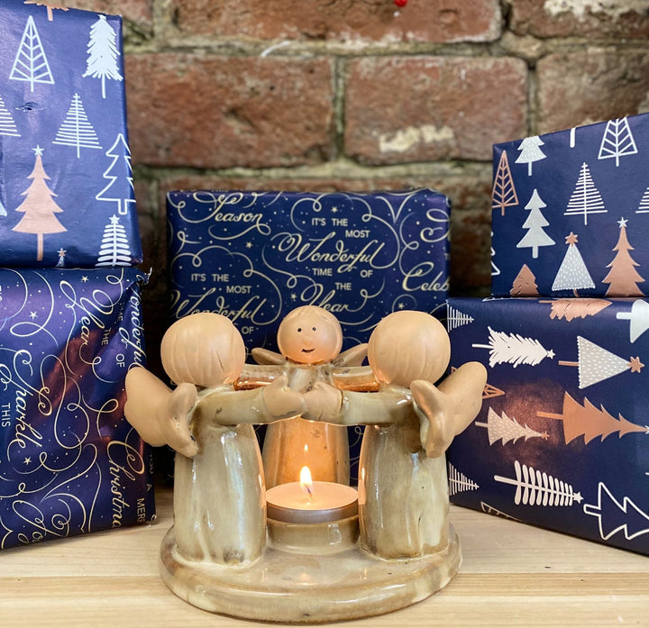 Ceramic angel ring tea light holder in a natural tone. A ceramic holder with three angels linked in a circle around a tea light cradle. This item comes boxed and would make a festive gift. Overall boxed measurements: D14 x H11 x W15.5cm