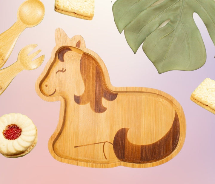 Made from 100% planet-friendly bamboo, you'll find a whimsical unicorn design on this baby plate. A brilliant way to wave goodbye to single-use plastic and have fun at the same time. This item has been hand-polished and crafted from natural bamboo which may cause subtle variations in the colour and engraving, making each one beautifully unique. Measurements: D18.9 x H1.2 x W20.5cm
