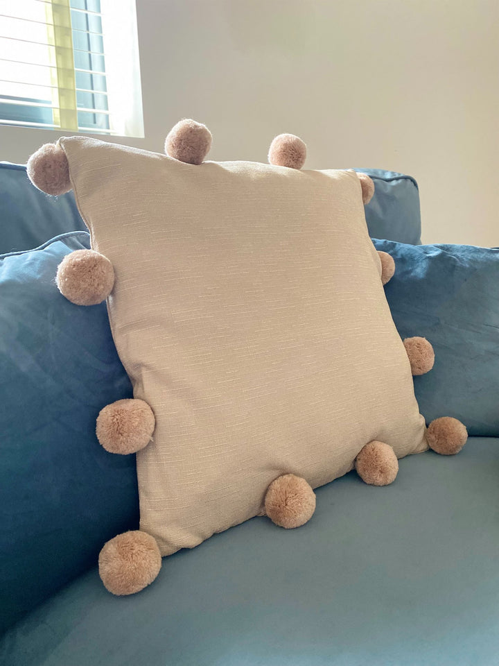 Beige square shape scatter cushion with fluffy pompoms. Add a fun touch to your sofa or chair with this modern, square shape scatter cushion. The cushion cover and insert are made from polyester and adorned with beige pompoms around all four edges. This cushion is suitable for hand washing only and features a full length zip on one side. Measurements: D3 x H45 x W45cm