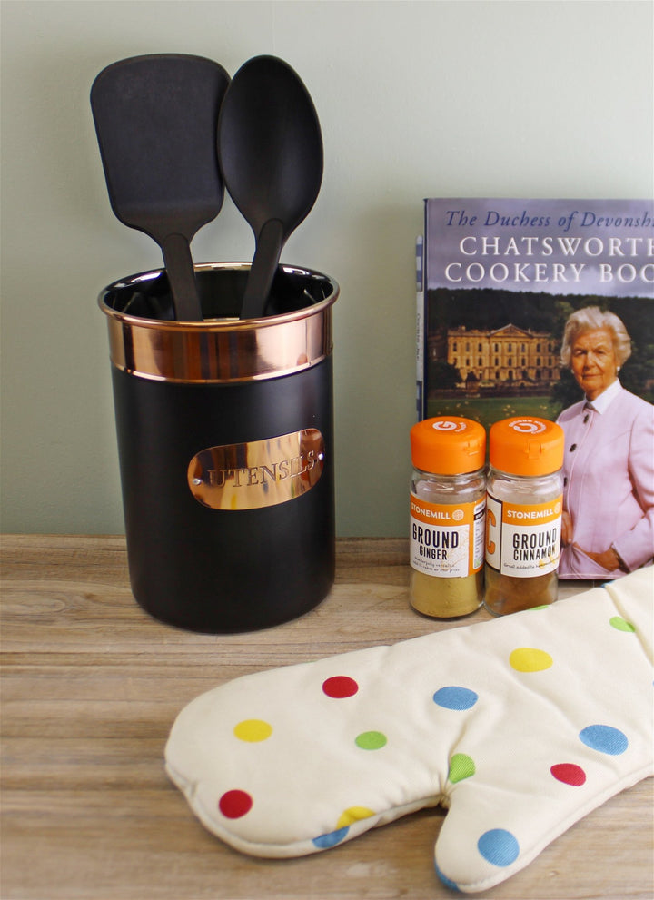 Black and copper metal utensils holder. Co-ordinating items available. High quality made of 100% durable stainless steel embossed with a copper coloured utensils label. Measurements: 12.5 x 18 x 12.5cm SKU: KG0688