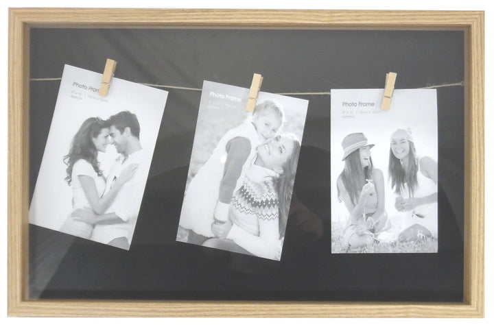 A natural wood effect box style photo frame with pegs which takes three 6" x 4" photos. This unusual frame is perfect for displaying special photos on the wall anywhere in the home. There is a washing line style string and three mini clothes pegs to hold your chosen photos against a plain black background. The frame also allows for your pictures or other small bits of memorabilia to truly stand out in pride of place behind the glass front. This frame is designed to be wall hung using the picture bracket on the back. (fixings not include.) Would make a great unusual gift. Measurements: 28 x 43 x 4cm SKU: PH2002