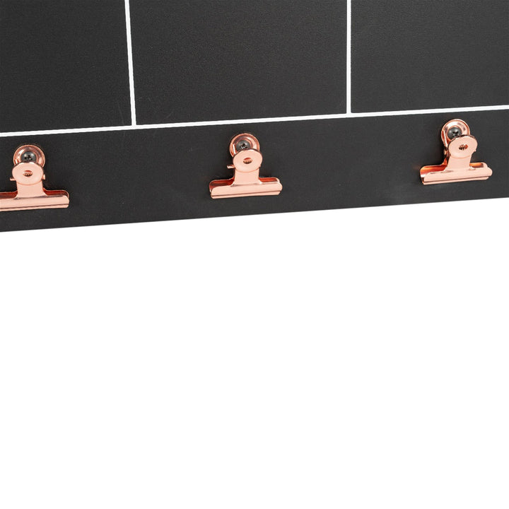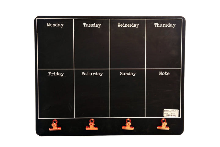 This Black Weekly Memo board with four copper clips would fit perfectly in any home. The item features seven days and a notes area, enabling daily planning for the whole family. The dimensions of each day section is 12x16cm. Overall measurements are: D3.5 x H40 x W50cm SKU: KG0247