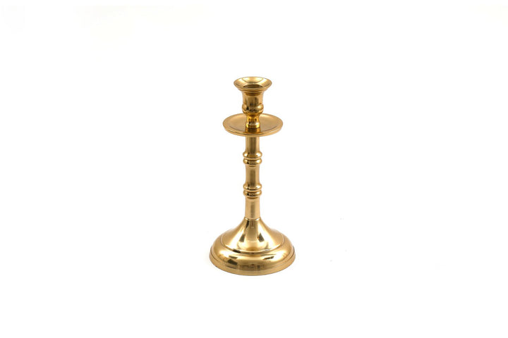 Brass colour traditional style candle holder for a tapered dinner candle of 2cm diameter. The candlestick’s height is 22cm and base is 10cm diameter. Overall measurements are: D10 x H22 x W10cm SKU: BP0139