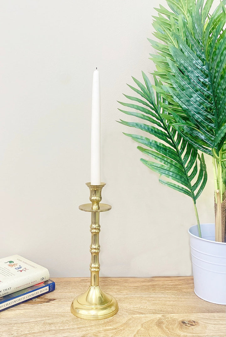 Brass colour traditional style candle holder for a tapered dinner candle of 2cm diameter. The candlestick’s height is 27cm and base is 10cm diameter. Overall measurements are: D10 x H26.5 x W10cm SKU: BP0138