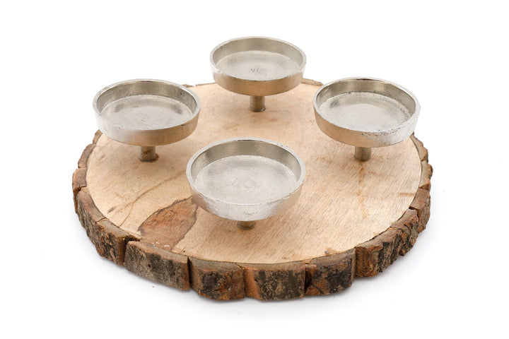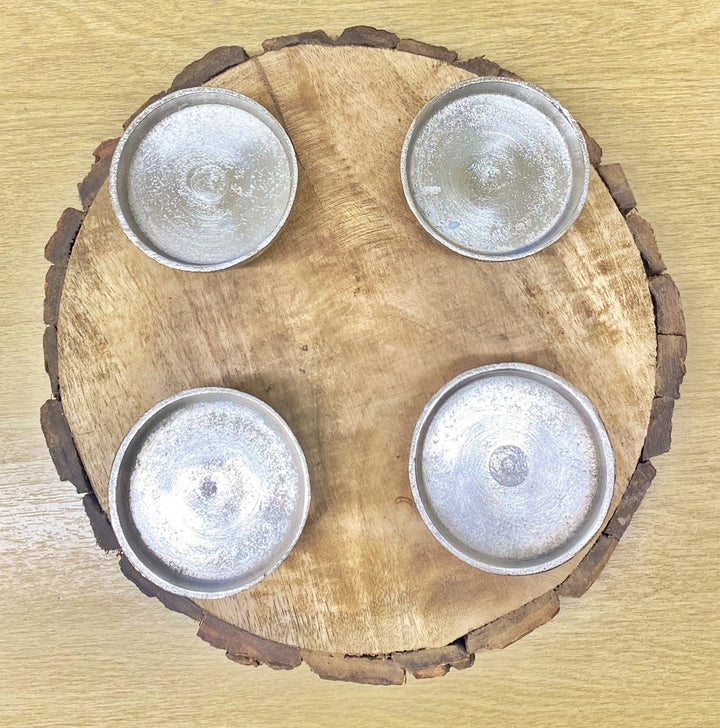 A rustic wood base edged in real bark holding 4 metal elevated candle cups. This rustic item holds pillar candles with a maximum diameter of 6 cm and would add character both inside and outside of any home. Measurements: D28 x H8 x W28cm SKU: CH6156