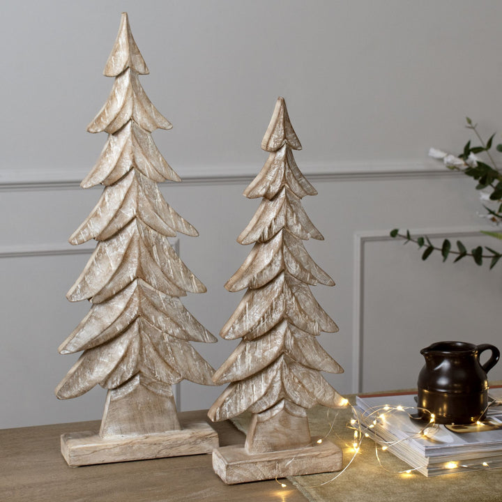 This meticulously crafted wooden decoration captures the essence of rustic charm while offering an updated interpretation of traditional holiday décor. The intricate carving technique results in a texture-rich surface that catches light and shadow, creating depth and visual interest from every angle. Available in two complementary sizes, these trees work harmoniously when paired together, creating an architecturally pleasing display that draws the eye upward through staggered heights. The organic wood grain patterns make each piece uniquely individual, while the clean, modern silhouette ensures broad market appeal. For maximum visual impact, consider pairing with the Antique White Wooden Sparkle Star as a coordinating accent piece, or enhance the woodland theme with the LED Winter Wreath with Eucalyptus and Lamb's Ear. The Noel Collection Star Topped Glass Decorative Tree offers a contrasting material that amplifies the wooden tree's tactile appeal. Perfect for both traditional and contemporary retail environments, this piece performs exceptionally well in window displays and shelf arrangements, offering your customers a fresh take on seasonal décor that seamlessly integrates with existing holiday collections. The versatile design works equally well in rustic farmhouse settings or minimal modern spaces, making it an excellent choice for retailers catering to diverse customer preferences.
