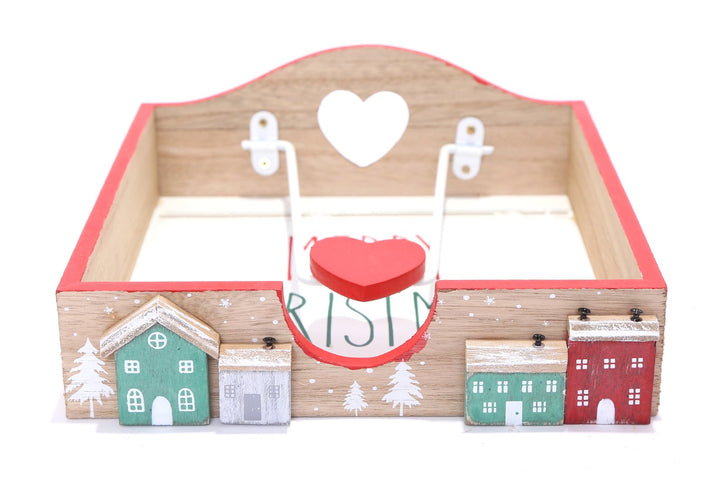 A square wooden napkin holder with house decoration. A wooden napkin holder and metal arm with a heart detail to secure napkins. The tray is 4cm in depth at the front and 6.5 cm at the back. There is a 'Merry Christmas' message painted inside the base of tray. Overall measurements: D19.5 x H7 x W18.5cm