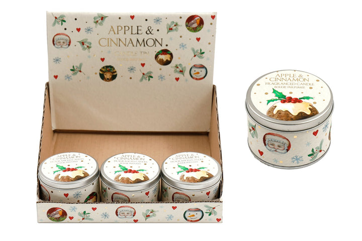 Christmas pudding candle in tin with lid. Fragranced with Apple and Cinnamon. Measurements: D7.5 x H5 x W7.5cm