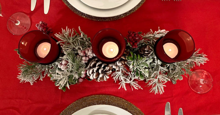 Triple tea light holder on black stands. An attractive centre piece for any Christmas table. A black wire base with a garland of berries, leaves and pine cones dusted with artificial snow. Three red glazed tea light holders in glass with a diameter of 7cm and a height of 8cm. Tea lights not included. Overall measurements: D15 x H18 x W52cm