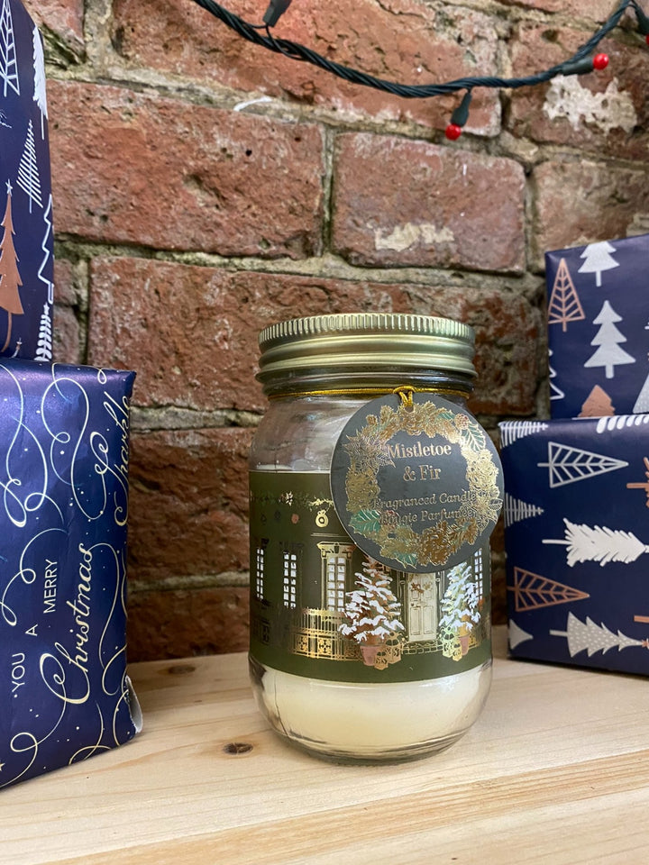 White Mistletoe and Fir fragrance candle in glass jar. A festive white candle in a glass pot and lid, with a Christmas door and window scene in green and gold. This item would add festive cheer to any home. Measurements: D9 x H13 x W9cm