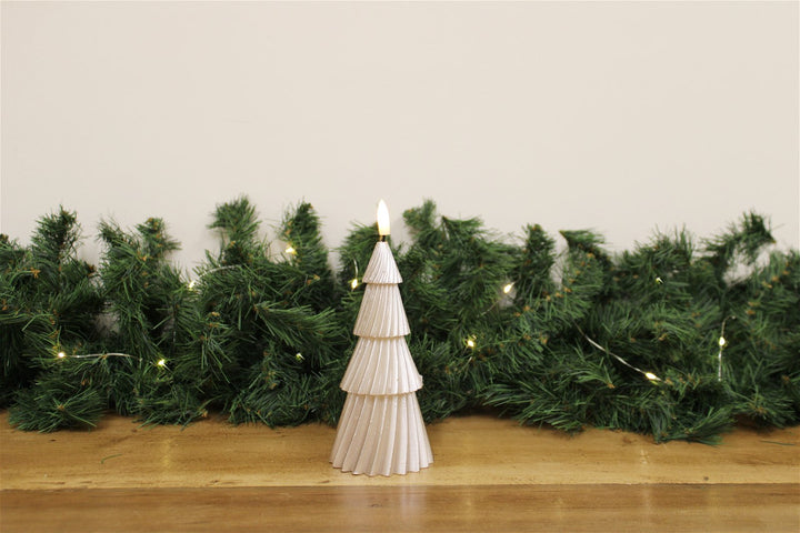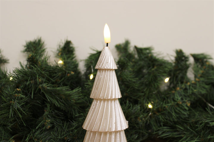 Wax moulded gold Christmas tree LED candle. Comes fitted with 1 x CR2032. Measurements: D7.5 x H18.5 x W7.5cm