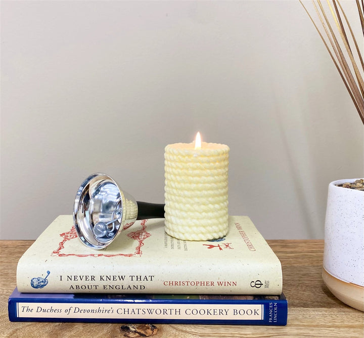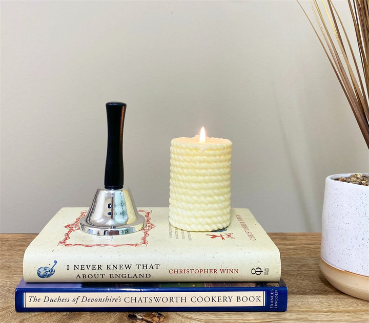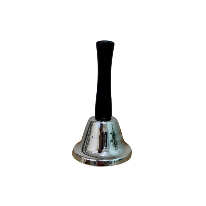 A small hand bell with black plastic handle and polished silver bell. The hand bell sound is loud which makes it functional for many different environments. Measurements: D6.5 x H12 x W6.5cm SKU: HH5336