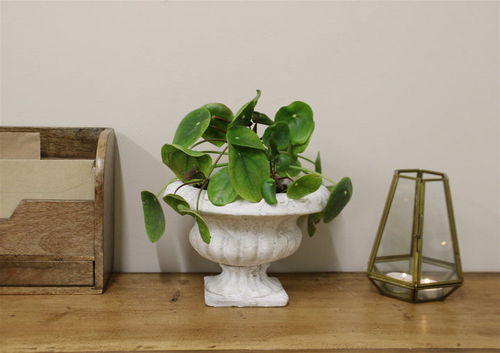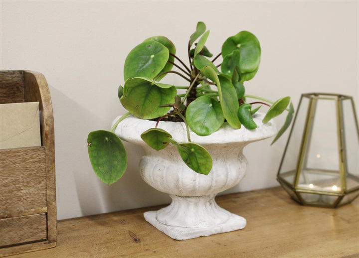 An antique looking classic low urn planter, with stepped base and detailed bowl. The perfect piece for a garden or home entrance, constructed from cement. Measurements: D20 x H14 x W20cm