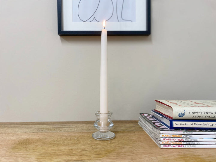 A Clear glass taper candle holder suitable for candles with a maximum diameter of 2cm. This item is plain but stylish and is easy to clean and durable for long term use. Measurements: D6 x H6 x W6cm