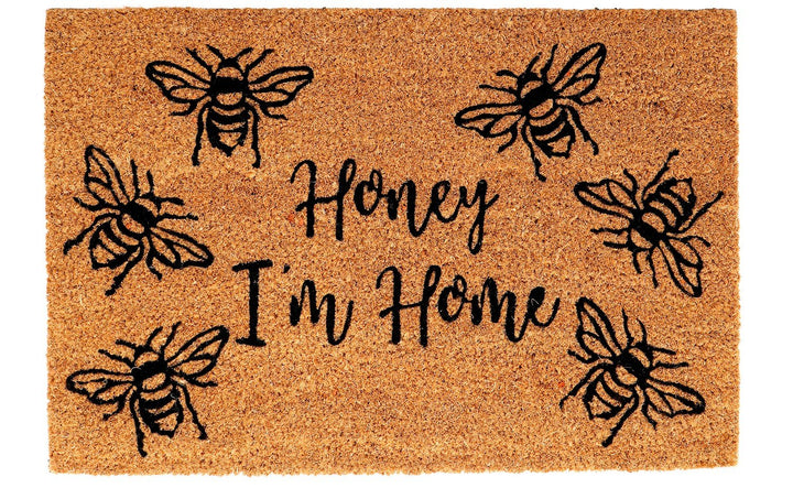 This coir doormat with "Honey I'm Home" written amongst bees would be a perfect gift for a new home to add love and a homely feel at the entrance with a touch of comedy. Coir mat with black writing "Honey I'm Home" and Bee picture. Measurements: D1.5 x H40 x W60cm SKU: DM0070