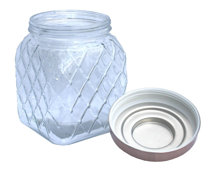 A fabulous retro style glass jar with copper coloured lid. This lovely jar has a diamond shaped embossed design to all sides making this a timeless design suitable for all decorating styles from modern to traditional. The copper coloured lid is easy to screw on and off and combines a classic metallic colour with an on-trend style that adds a warm and rich colour to any room in the home! Ideal for storing dry foods in the kitchen, or to store small items in the bedroom, bathroom, or simply as a stand alone decoration placed on a coffee table or windowsill. Hand wash only. Measurements: 20.5 x 14 x 14cm SKU: KG0096