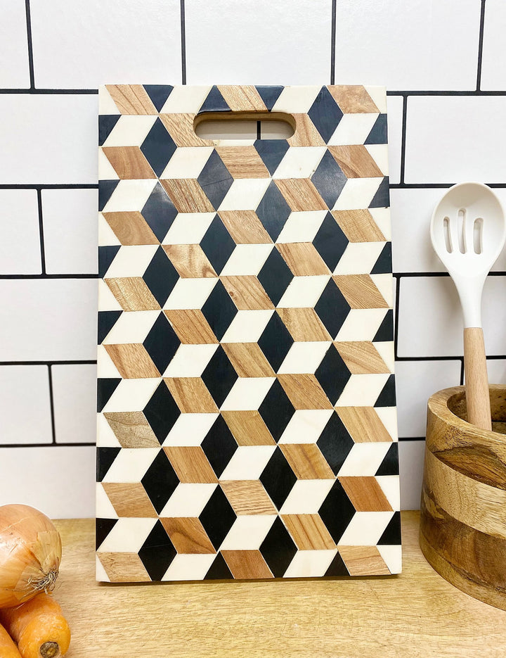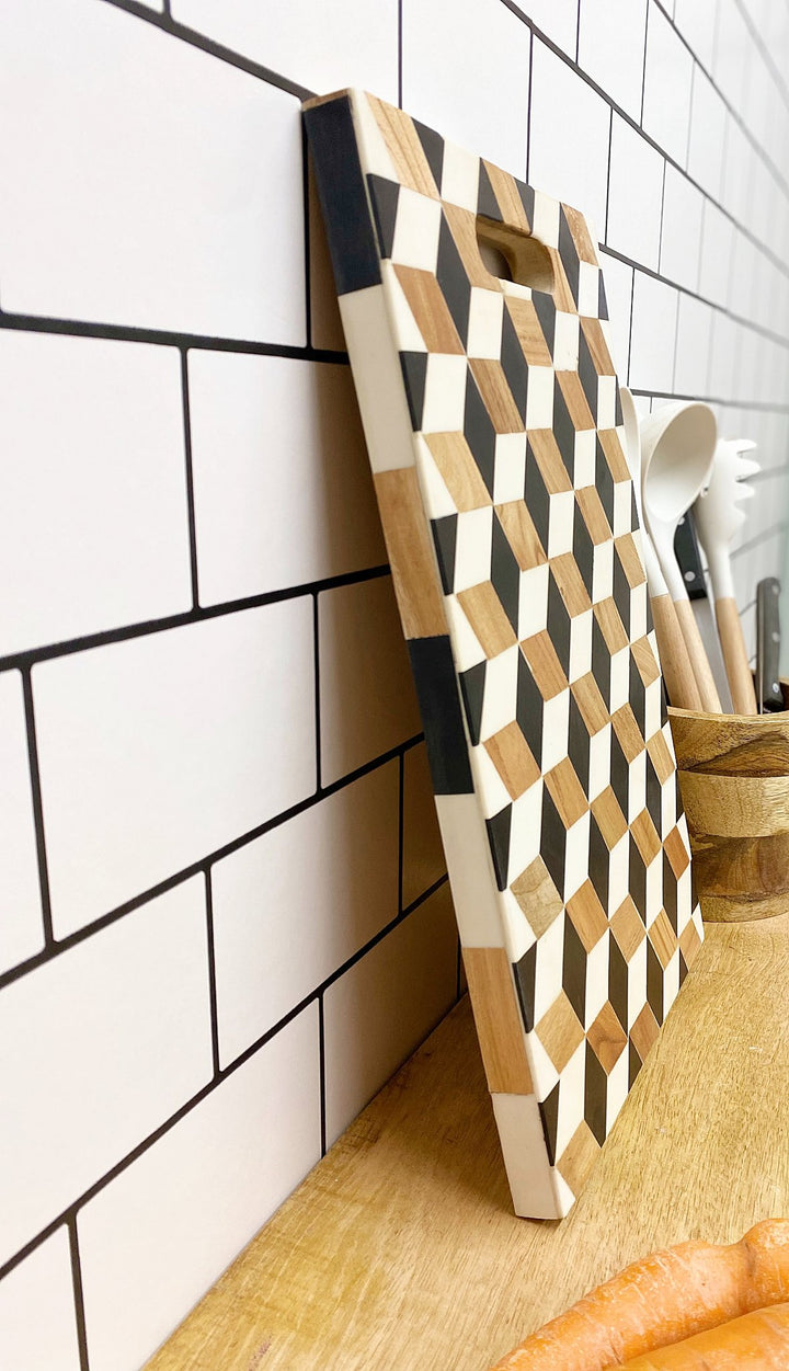 An intricate MDF serving tray with a polyresin cube design overlay with cut out handle. This serving tray is food safe, can be used to cut up or serve food on or is unique enough to have on display. Measurements: D2 x H40 x W24.3cm