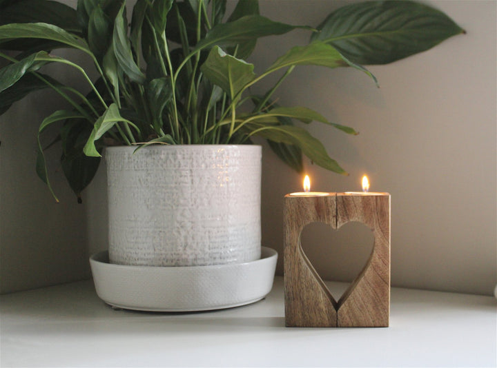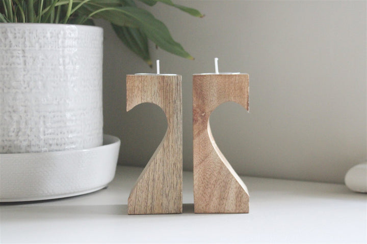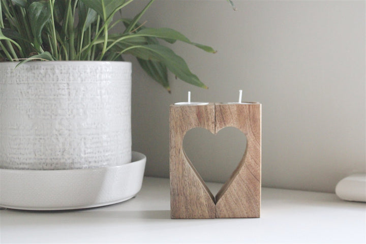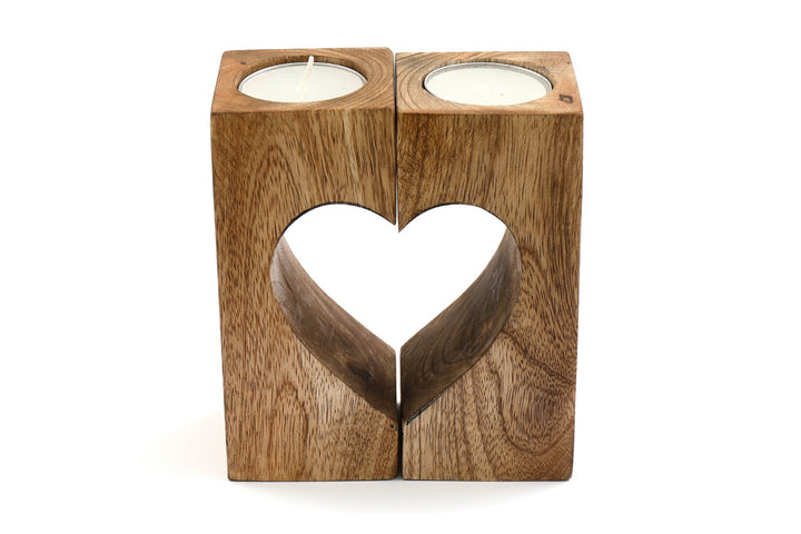This charming set of two tealight holders when displayed together form and open heart in the middle. These tealight holders are made of high-quality mango wood, which gives them a unique, natural look that's perfect for any home decor style. Perfect gift idea, comes complete with two tealights. Measurements: D5 x H13 x W10cm