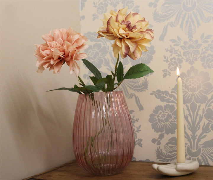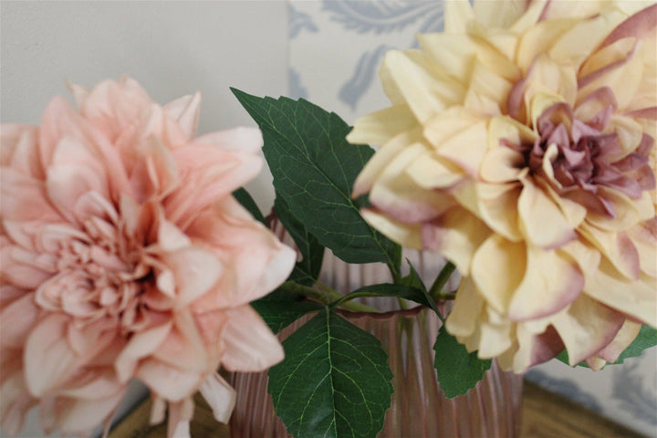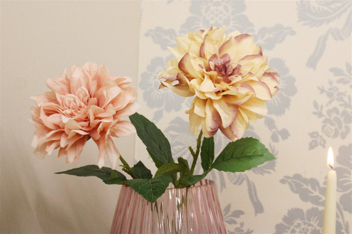 Two Dahlia stems captured at their fullest bloom, in shades of champagne and pink. The natural-looking flowers will remain fresh for years and never wilt or wither. Use on their own or in a large bunch, or mix and match with other faux stems to create an everlasting bouquet. Perfect for creating wedding bouquets, wreaths, potted arrangements and so much more. Measurements: D14 x H62 x W14cm