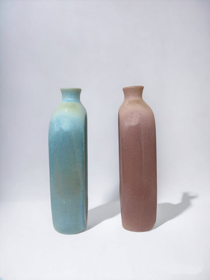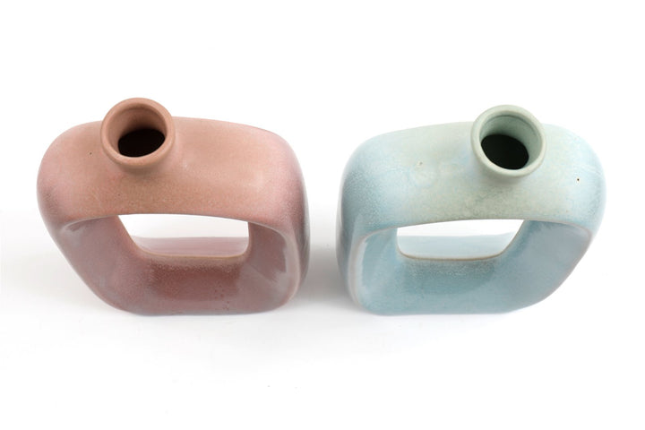 Set of two doughnut bud vases, unique and playful decorative accessories that can be used to display flowers and other natural elements. As the name suggests, the vases have a shape that resembles a doughnut or a ring. The doughnut bud vase is a fun and quirky addition to any decor style, from modern to bohemian. Comes in a set of two matt blue and pink. Each vase is 5.5 cm deep and made of high-quality ceramic. Measurements: D11.5 x H24 x W14cm