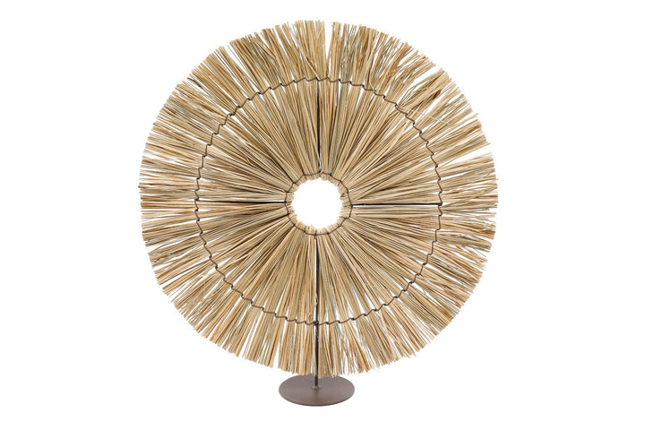This raffia sunburst inspired decorative item would bring hint of nature into the home. The raffia measures 50cm and the plinth measures 12cm. Overall measurements are: D12 x H54 x W50cm SKU: NI0989