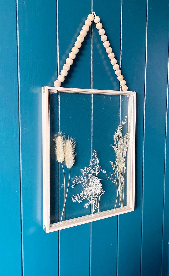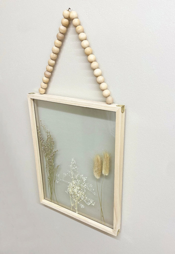 Delicately pressed assortment of dried wild grasses, on display in-between two pieces of glass encased in a 25 cm x 32 cm wooden frame. The frame features a string of wooden beads, perfect for bringing a floral flourish to your walls. Overall height of frame including the string of beads when hung from a fixing on a wall is 49cm. Measurements: D2.5 x H32 x W25cm