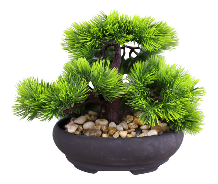 Eastern Faux Bonsai Tree in Fir Tree style Give your home a touch of oriental flair with these small but perfectly formed faux bonsai. MATERIAL COMPOSITION 70%PE, 10% stone, 10%FOAM , 10%terracotta Measurements: 26 x 16 x 17cm SKU: TJNE0029