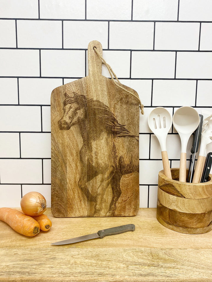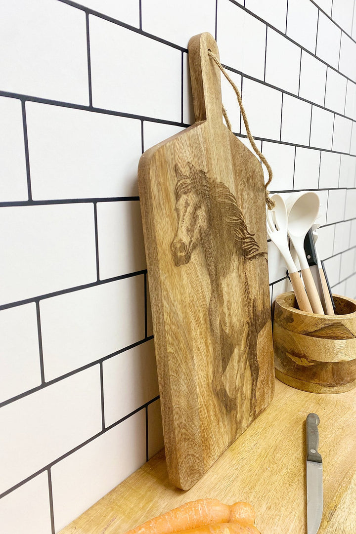 Natural wood chopping board with a striking engraved portrait of a horse, with a jute string loop. A striking piece that would grace any home. The board is 50cm long including the handle, the main body of the board is 36cm long with the engraved portait of the horse covering the majority of the board. Measurements: D25 x H2 x W50cm