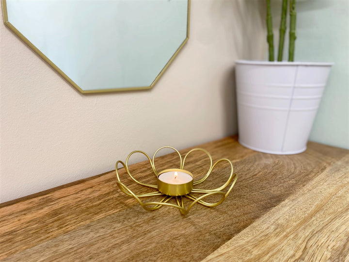 Metal gold coloured flower shaped tealight holder. The wire is crafted to replicate the petals of a flower with the tealight holder centralised. Measurements: D13 x H3.5 x W13cm SKU: BP0106