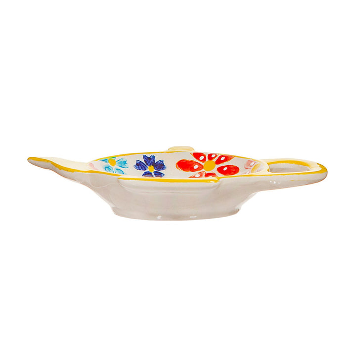 A characterful addition to add to the kitchen side. Featuring a 70s-inspired floral pattern. Complete with a vibrant colourway of red, yellow and blue. This teabag tidy is hand finshed and made form Kaolin. Measurements: D13 x H2 x W10cm