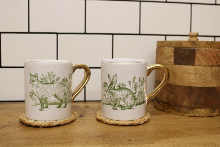 Set of two stoneware mugs, illustrated with forest animals including a fox and rabbit. Delicately finished with painted gold handles. Perfect gift idea, each mug has the capacity to hold up to 320ml of liquid. Measurements: D8 x H10 x W12cm