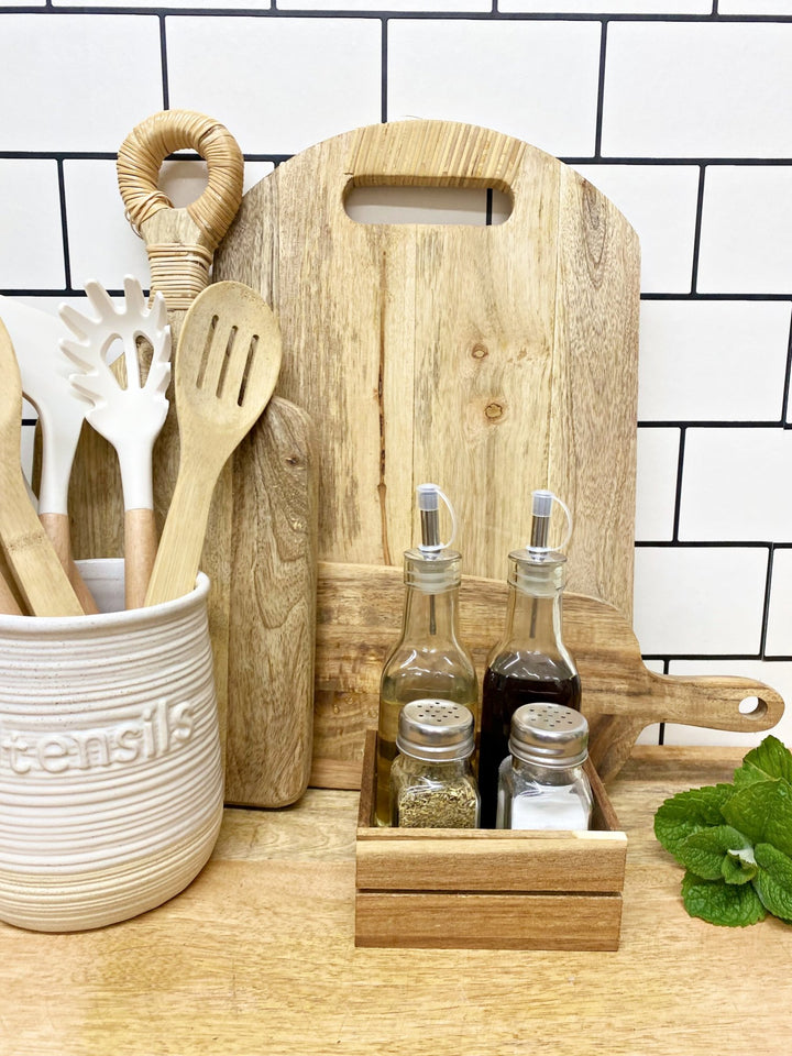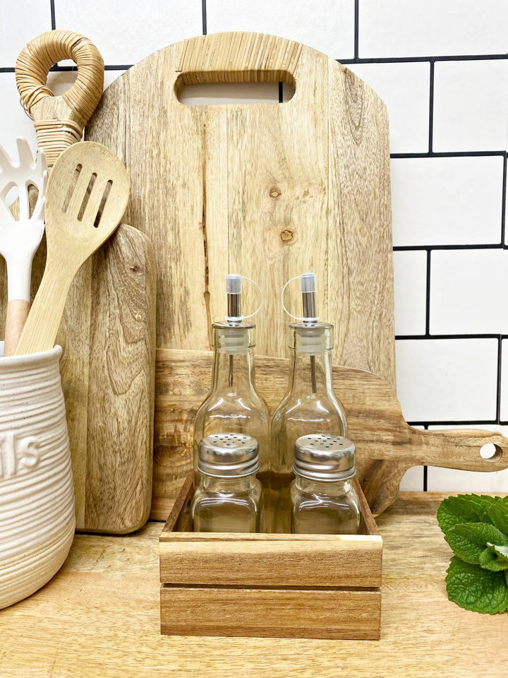 This four piece condiment set in wooden crate is a handy kitchen accessory that allows you to keep your favourite dressings and seasoning organised and easily accessible. The set includes two glass shakers and two drizzlers, each designed to hold a different type of dressing such as salt, pepper, vinegar, oil, or any other topping of your choice. The overall design of this dressings set with a wooden holder is rustic, made from Acacia wood and features simple lines that complement a wide range of kitchen decor styles. Whether you're using it for a family dinner or a large party, this dressing set is a convenient and stylish way to serve up your favourite dressings and seasoning. Measurements: D11 x H20 x W12cm