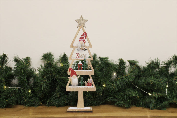 Wooden Christmas four tier tree on base. With two climbing Gonks and gold star. Measurements: D4 x H30 x W9cm