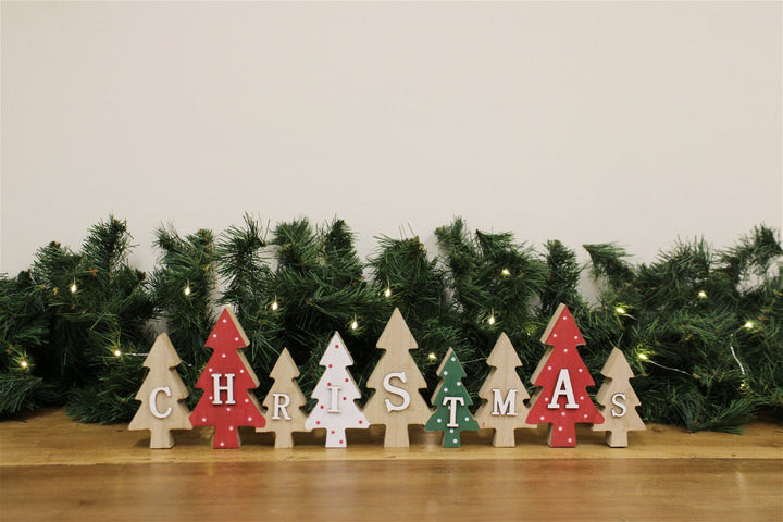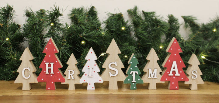 A row of adjoining wooden cut-out Christmas trees with white wooden letters, a festive decoration that can be used to add a touch of festive cheer to any room. Some of the trees are painted Red, Green and White, decorated with a spotty finish and the remaining trees have a natural wood finish. The cut-out trees are made of MDF and Plywood and are designed to resemble the shape of a Christmas tree. Measurements: D2 x H11 x W40cm