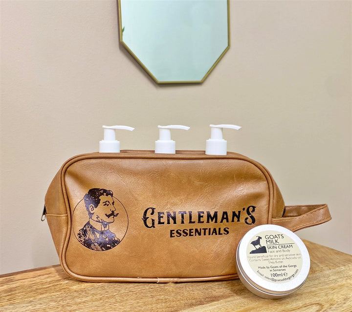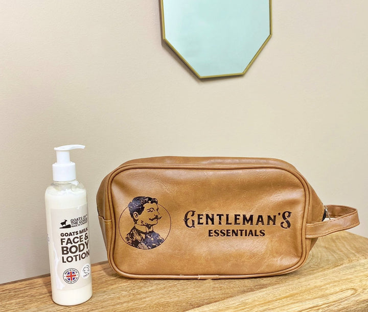 A faux leather wash bag with zip fastening, featuring the gentleman's range motif. An ideal accessory for the gentleman travellers, compact and stylish. Part of the gentlemen's essentials range. Measurements: D15 x H3 x W33.5cm SKU: GR0001