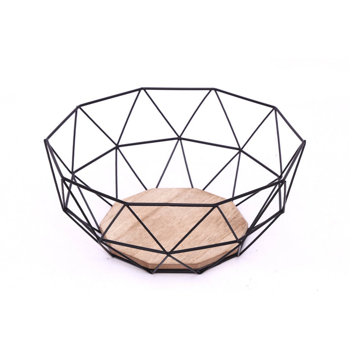 A bowl that utilises a geometric wire theme to give a unique look to the design. The bowl can be used to store a variety of items of varying sizes. The bowl itself is made out of black metal with the base being made out of a wood effect robust MDF. The base diameter is 15.2cm. Overall the measurements are: D26 x H12 x W26cm
