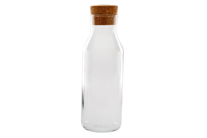 A glass carafe style storage canister with a soft cork stopper providing an air tight container for many different food products. The carafe shaped glass is 26cm tall with a slight narrowing at the neck from a base diameter of 8.5cm to 6cm. Boxed measurements: D10 x H30 x W10cm SKU: KG1037