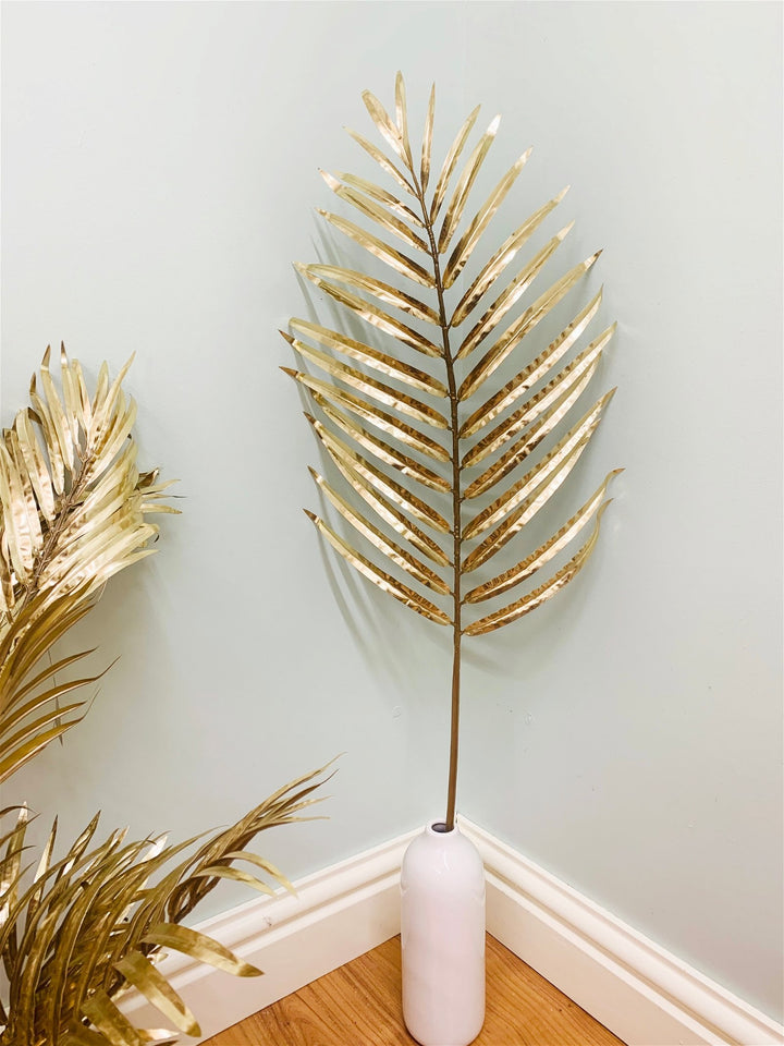 This single gold palm leaf decoration could be used as a wall or shelf ornament or could even be placed in a vase. It would brighten up any area and fit in any home. A single gold palm leaf with length of 49cm and stalk length 37cm. Overall measurements are: D0.5 x L87 x W29cm SKU: TJB0060