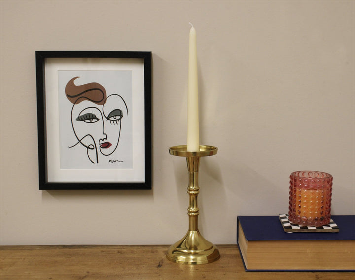 Metal candlestick in a gold colour, suitable for one dinner candle or one pillar candle up to 9cm in diameter. Traditional style candlestick holder with a 9 cm diameter drip tray. Made from Aluminium. Measurements: D10 x H25 x W10cm