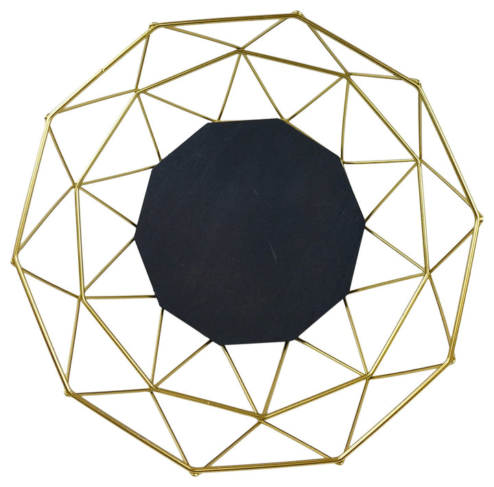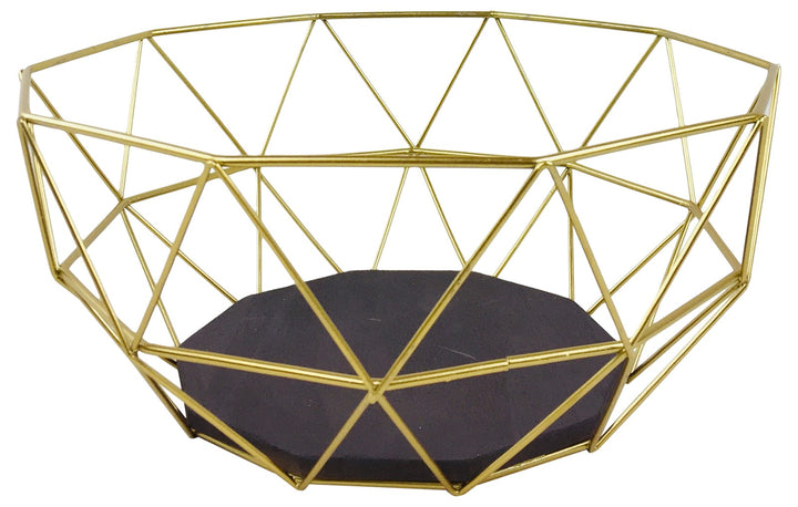 A bowl that utilises a geometric wire theme to give a unique look to the design. The bowl can be used to store a variety of items of varying sizes. The bowl itself is made out of iron with the base being made out of a wood effect robust MDF. Measurements: W25cm D26.4cm H11.2cm. The base diameter is 15.2cm. SKU: GE0061