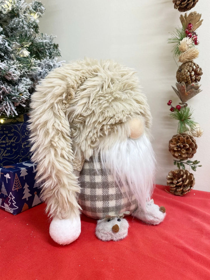 This delightful gonk has a super soft long conical floppy hat, a beige and cream check body, snowy white beard and cut slippers depicting little reindeer. He is simply adorable. His soft hat is 45cm long, his body is 13cm diameter and the reindeer slippers are 6cm x 5cm. Overall measurements are: D20 x H61 x W18cm