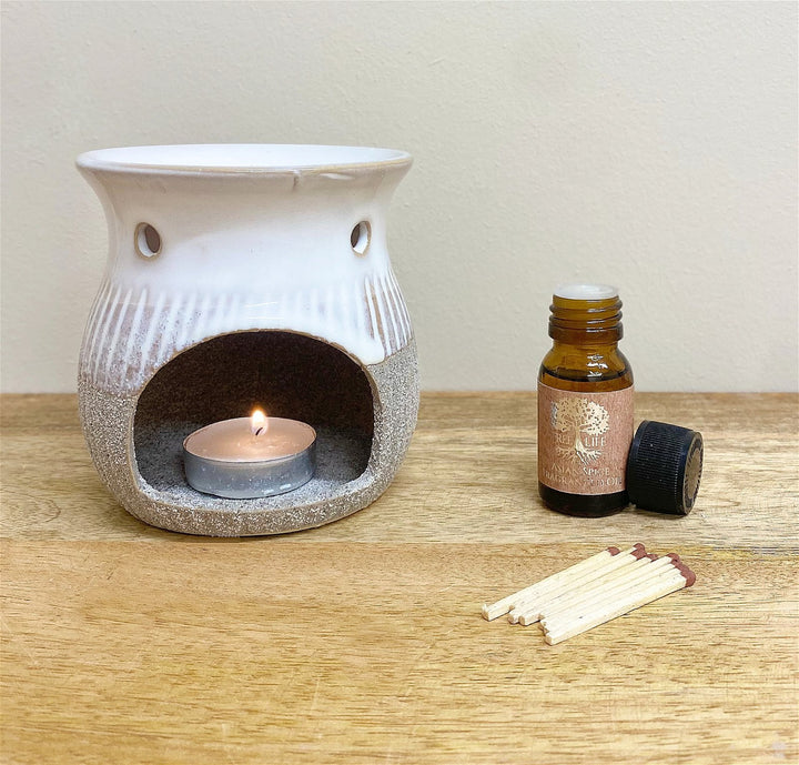 Grey ceramic oil or wax warmer with sandy finish base. A naturally stylish looking wax warmer than can also be used to burn essential oils. Perfect as a gift or scenting your own home, whilst experiencing the benefits of aromatherapy. Measurements: D10 x H10 x W10cm