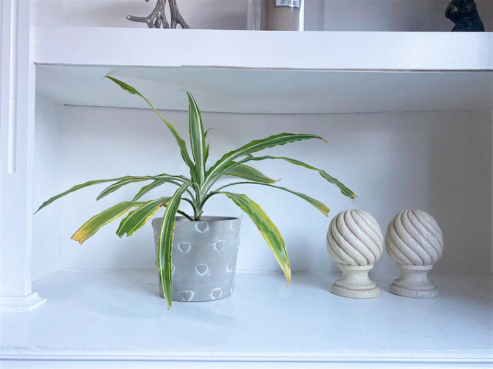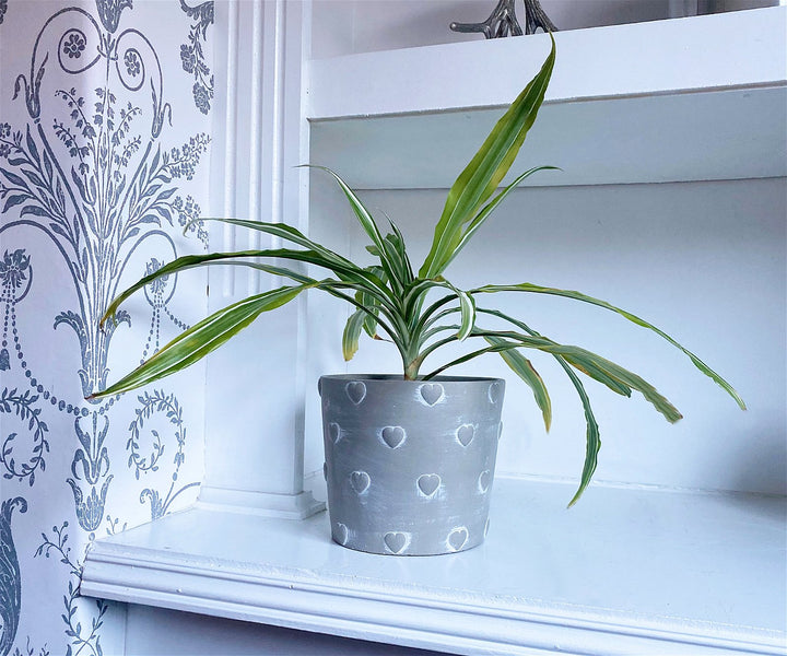 A sweet grey stone effect planter with embossed hearts outlined in white. This round planter is made from cement and decorated to have a stone like appearance. This useful round planter is 16cm tall and can be used to house indoor plants or used outside. This planter is a part of the Hearts collection. Measurements: D16 x H13 x W16cm
