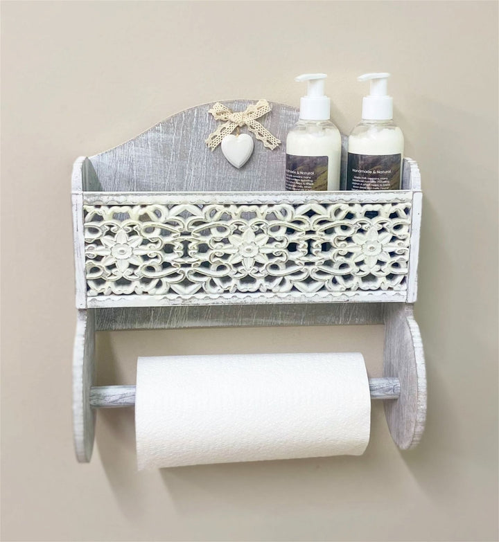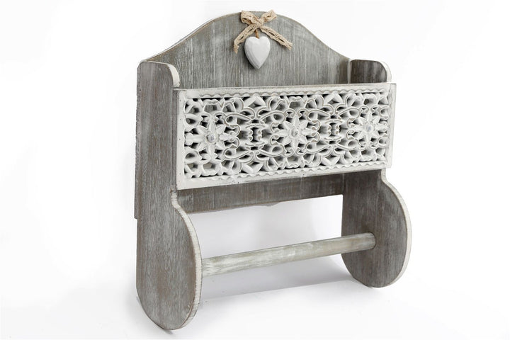 This shabby chic designed kitchen towel holder with handy storage area decorated with pretty carved out facing. The holder is enriched with a delicate heart shaped pendant and lace bow. A charming practical piece to compliment any home. The grey and white shades are stylish and simply stunning. The storage area is 6.5cm wide, 9cm deep and 28cm long, beneath is the rolled dowling to hold a standard kitchen roll. Overall measurements: D12 x H36 x W30cm SKU: KG1061