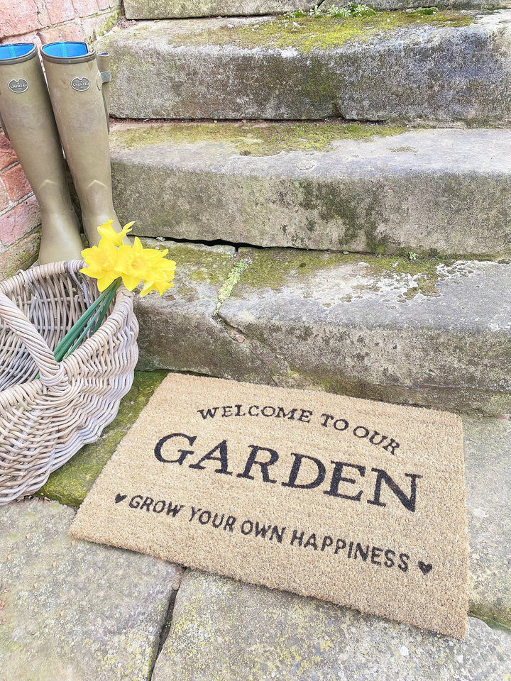 Add character to the entrance to your garden with the garden themed door mats. The door mat reads 'Welcome to our garden' 'Grow your own happiness'. Made from coir which is a strong, hard-wearing fibre which is ideal for doormats. The bottom of the mat is made from PVC which is flexible but tough and ensures that dirt is trapped in the mat itself. Measurements: D1.5 x H40 x W60cm